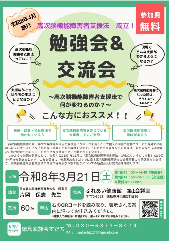 この高次脳機能障害支援法の制定に際し国会議員とともに尽力され法整備の立役者であります日本高次脳機能障害友の会理事長の片岡康則さんをお招きしてに高次脳機能障害支援法について分かり易くまた、今後何が変わるのかなどについて下記の要領にて講演していただく予定です(詳しくはチラシ参照)